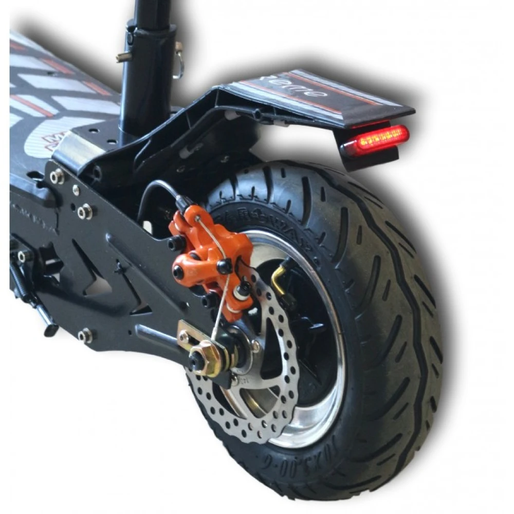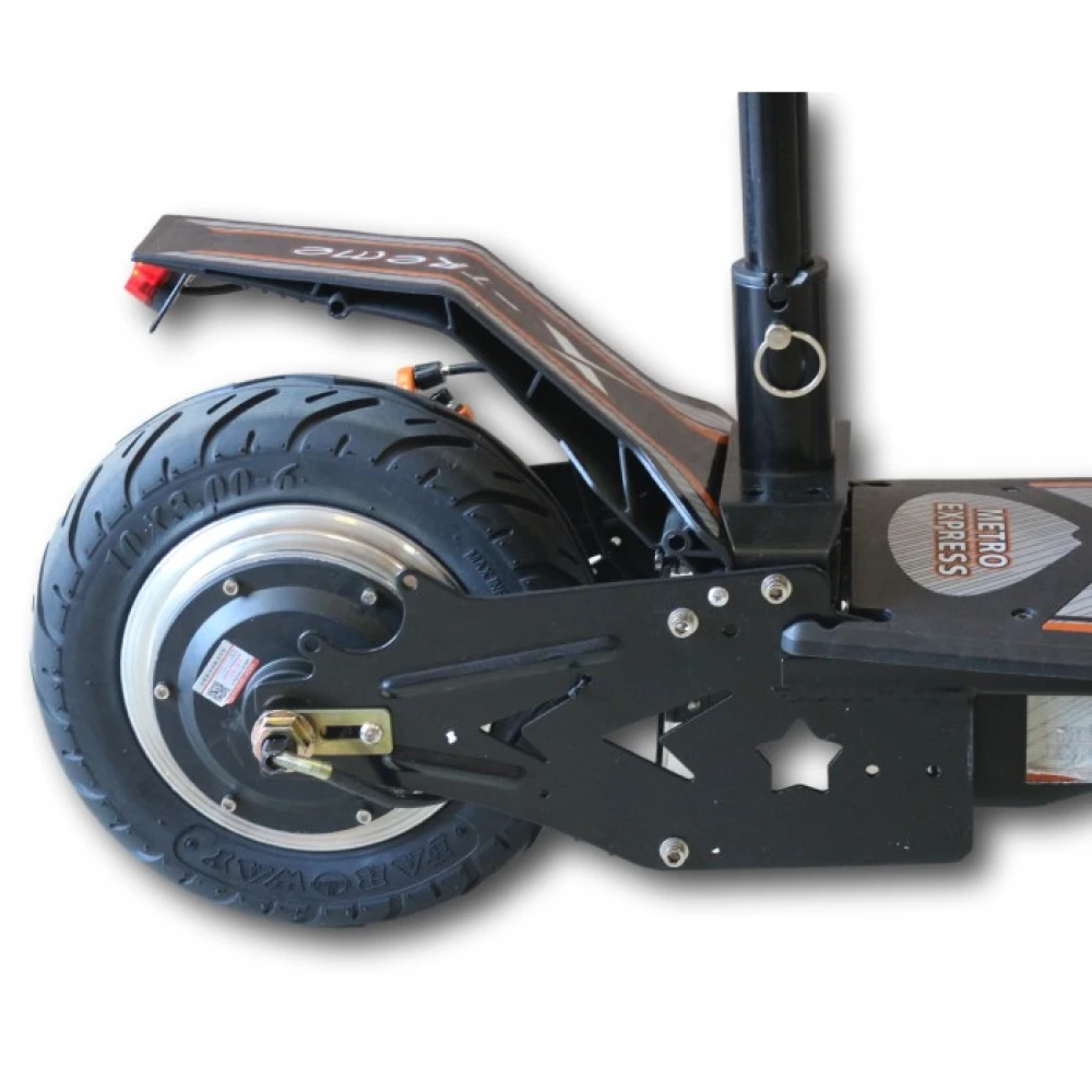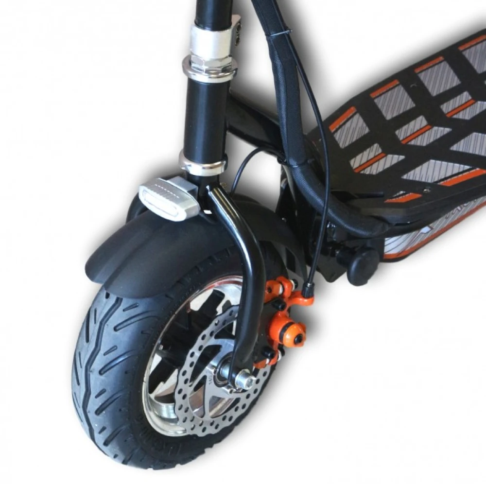 Самокат Uber Scoot Metro-express ES04 LITIUM оснащен мотор-колесом мощностью 500 Вт, имеет задний привод. Агрегат на ровной дороге со средней нагрузкой развивает скорость 25 км/ч. Аккумуляторная батарея емкостью 374 Вт*ч. Такого заряда хватает на 30 км пути. Зарядить аккумулятор можно за 3 часа. Благодаря широким десяти дюймовым колесам с протекторными, резиновыми шинами устройство более устойчивое, имеет хорошее сцепление с дорожным покрытием. Дисковые тормоза на обоих колесах позволяют уверенно совершать маневры передвигаясь в транспортном потоке.