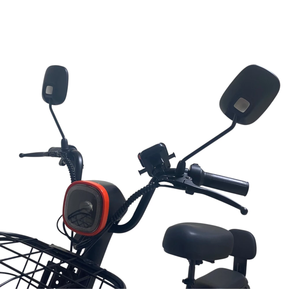 • Отличия от классических эл‑самокатов: полноценная рама, два сиденья, корзина, спинки и зеркала – это как гибрид городского электровелосипеда и компактного электроскутера.