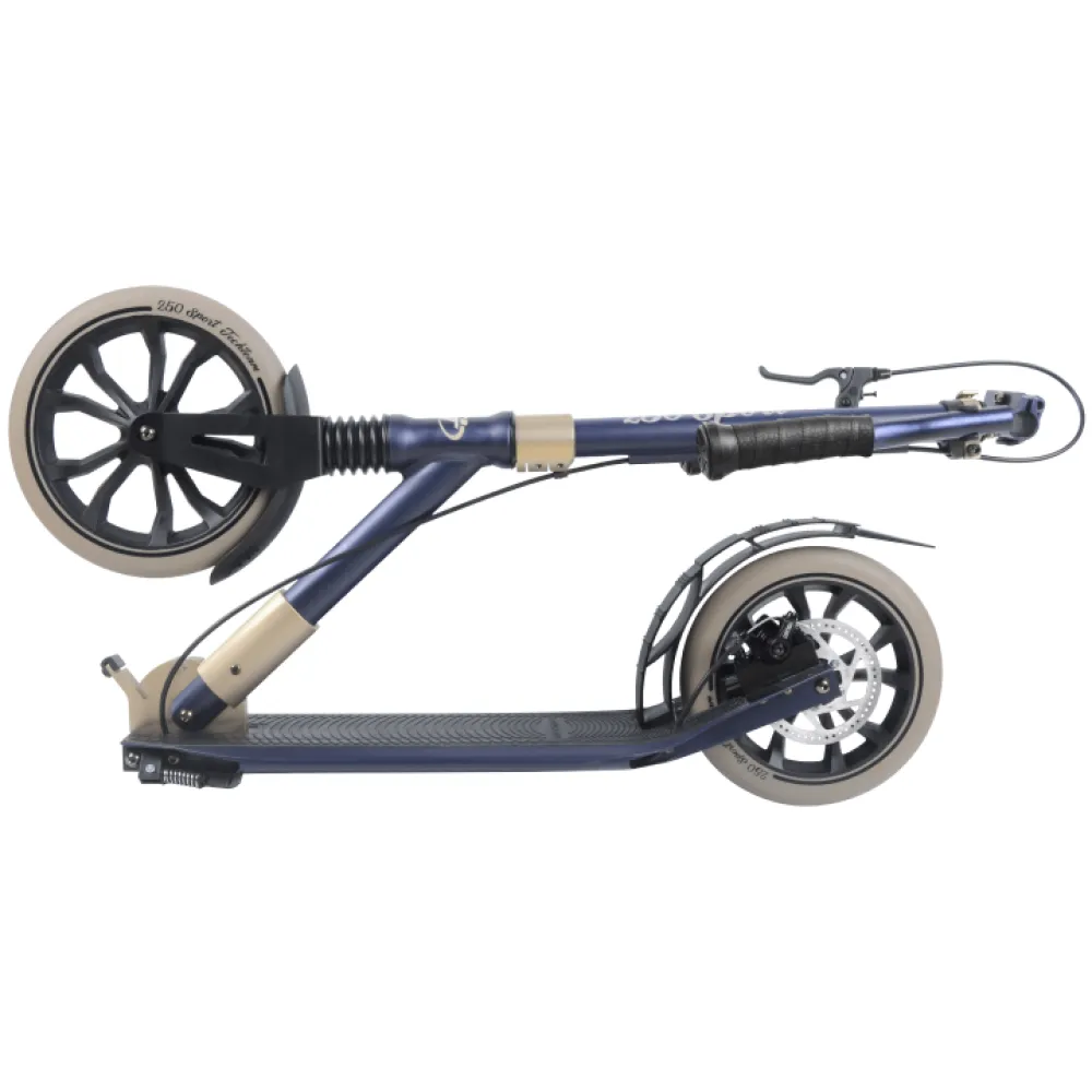Самокат TechTeam SPORT 250R представлен в синем цвете. Складной, алюминиевый, весом 6,5 кг агрегат прекрасно подойдёт ребёнку с 9 лет. Высота руля регулируется от 98 до 113 см, удобна для роста ребёнка от 135 см.