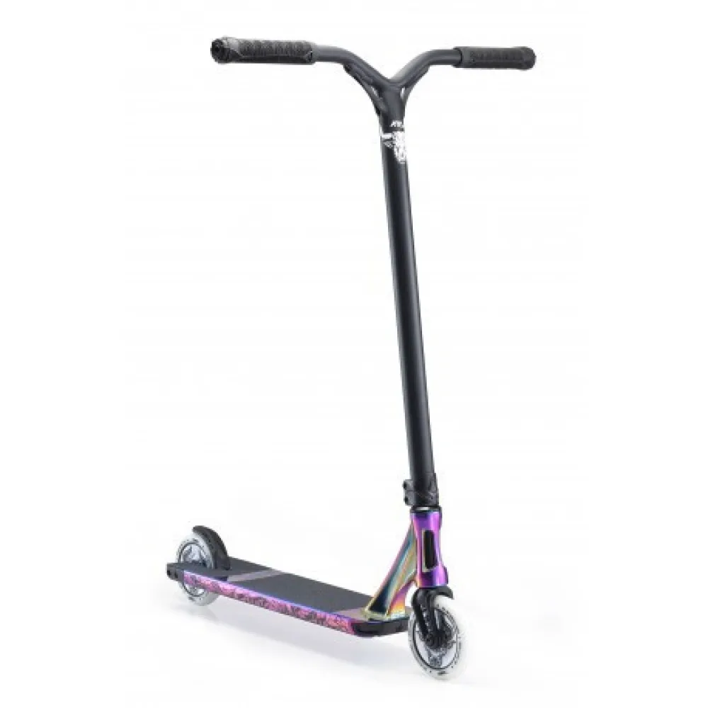 Трюковой самокат BLUNT COMPLETE KOS S6 CHARGE, цвета бензин - супермодель, рассчитанная на профессиональных гонщиков. Высококачественные комплектующие позволяют выполнять сложные элементы на специально оборудованных дорожках и отведенных зонах. Накладки на руль хорошо защищают руки райдера от перепадов температуры и соскальзывания. Самокат смотрится презентабельно и необычно на дороге.